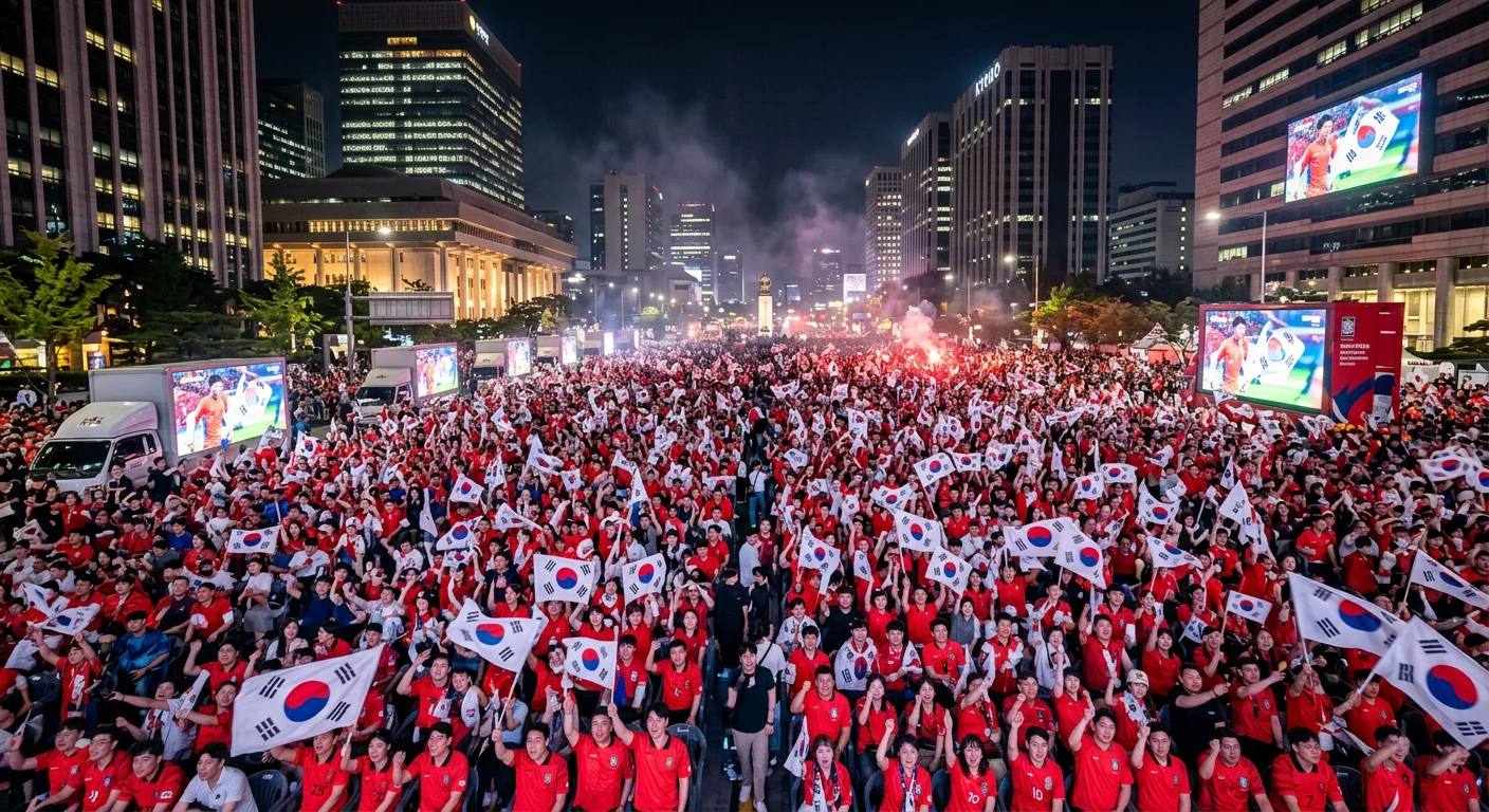 South Korea reached the 2002 FIFA World Cup semifinals, co-hosting with Japan. What followed was hard to predict. The Taegukgi didn't stay on government buildings. It poured into every intersection, every plaza, every screen-lit street corner in the country. Red Devils supporters in matching crimson shirts waved flags in massive numbers. 10+ million Koreans showed up for the semifinals alone.